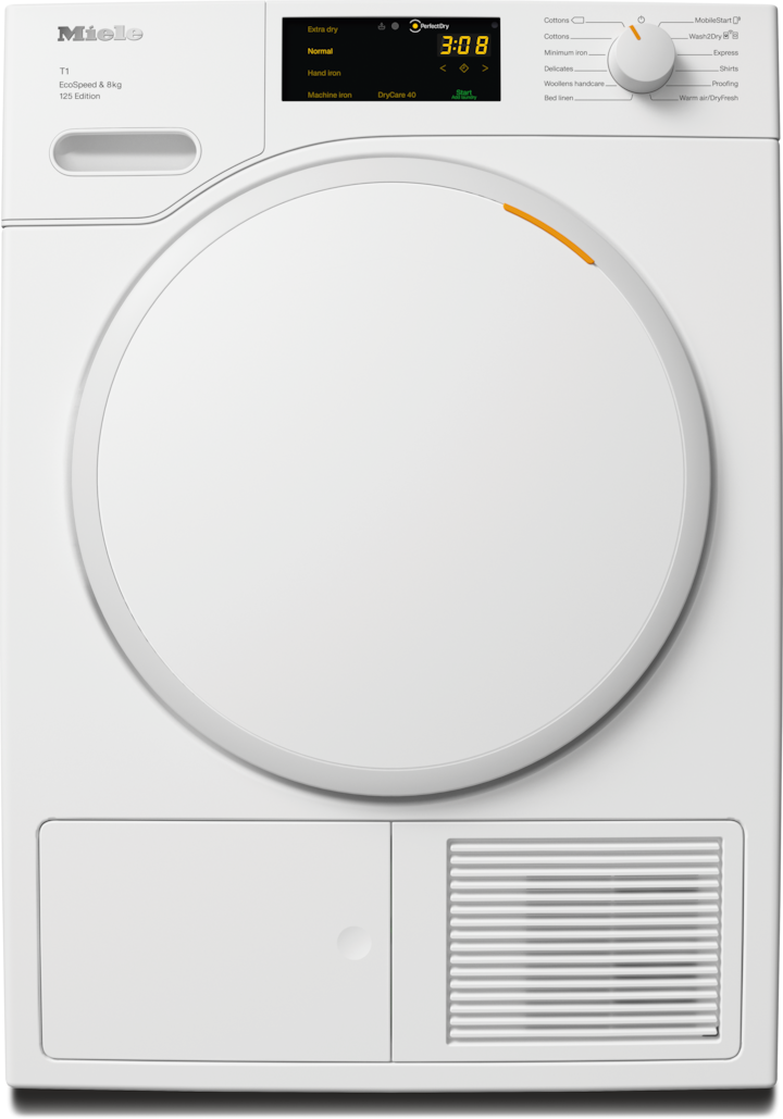 - 4.During the development phase of the T1 / T2 tumble dryer series, Miele tested models and core components in 5000 drying cycles (= 5 drying cycles per week for 50 weeks per year) in various programmes. Περισσότερα στο miele.com/20years